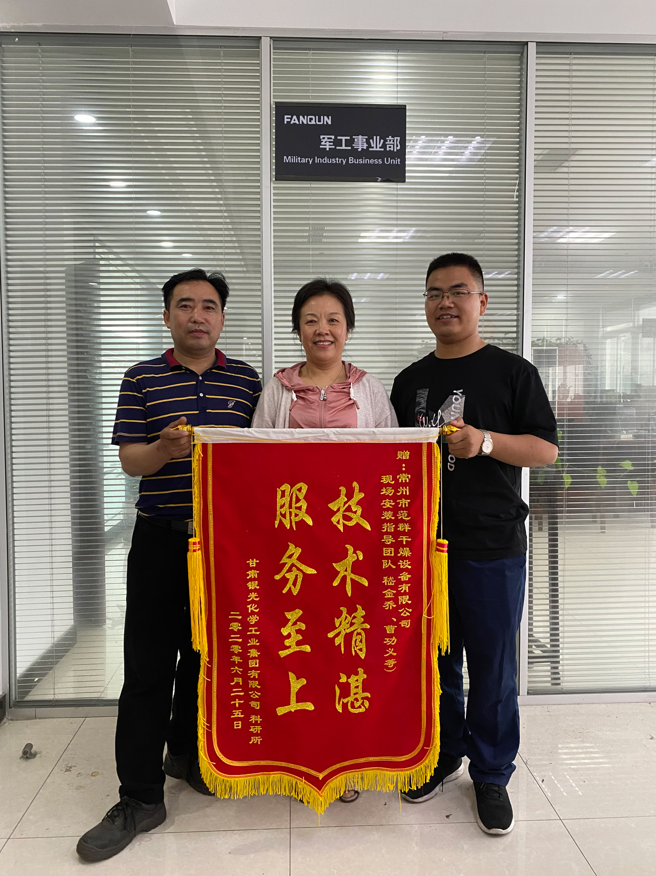 3月 26日,常州范群派出以嵇金喬為主的現場安裝指導團隊,該團隊秉承“服務于用戶,創精品工程”的理念,他們克服了高原反應,水土不服的生理不適;克服了疫情導致工期延誤的影響;克服了項目指導安裝中所遇到的各種困難,不屈不撓、加班加點、通宵作業、確保項目按時完工并通過驗收。常州范群這種全心全意服務于客戶的態度、吃苦耐勞打硬仗的精神,也獲得用戶的高度認可。為此,甘肅銀光化學工業集團有限公司科研所特別為常州范群現場指導安裝團隊頒發了“技術精湛 服務至上”的錦旗。他們用自己的不懈努力為常州范群、為自己贏得了榮譽。