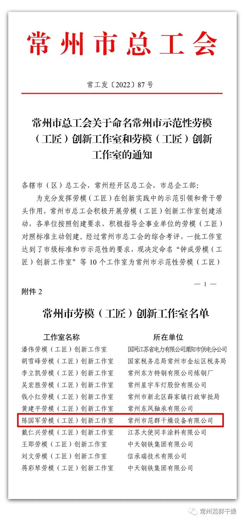 日前,常州市總工會公布17個常州市勞模(工匠)創新工作室名單,常州市范群干燥設備有限公司“陳國軍勞模(工匠)創新工作室”榜上有名。