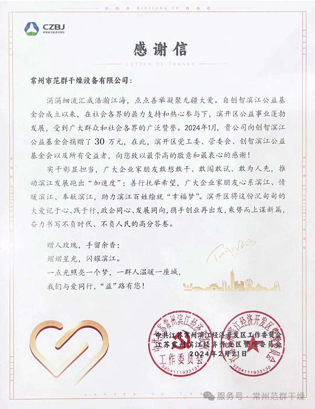 近日,常州市范群干燥設備有限公司向創智濱江公益基金會捐贈30萬元,以實際行動支持濱開區公益事業發展,用愛心善舉踐行企業社會責任,為區域公益事業注入溫暖力量。