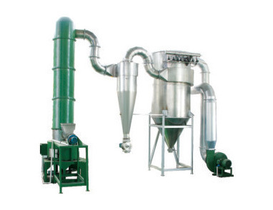 熱空氣切線進入閃蒸干燥機底部,在攪拌器帶動下形成強有力的旋轉風場。膏狀物料由螺旋加料器進入干燥器內,在高速旋轉攪拌槳的強烈作用下,物料受撞擊、磨擦及剪切力的作用下得到分散,塊狀物料迅速粉碎,與熱空氣充分接觸、受熱、干燥。脫水后的干物料隨熱氣流上升,分級環將大顆粒截留,小顆粒從環中心排出干燥器外,由旋風分離器和除塵器回收,未干透或大塊物料受離心力作用甩向器壁,重新落到底部被粉碎干燥。